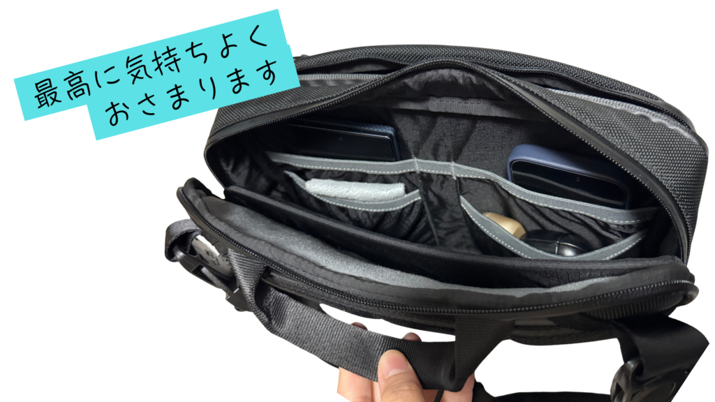 僕がこのバッグを手放せない最大の理由。それは「スマホやそれぞれの定位置に収まる」気持ち良さです。